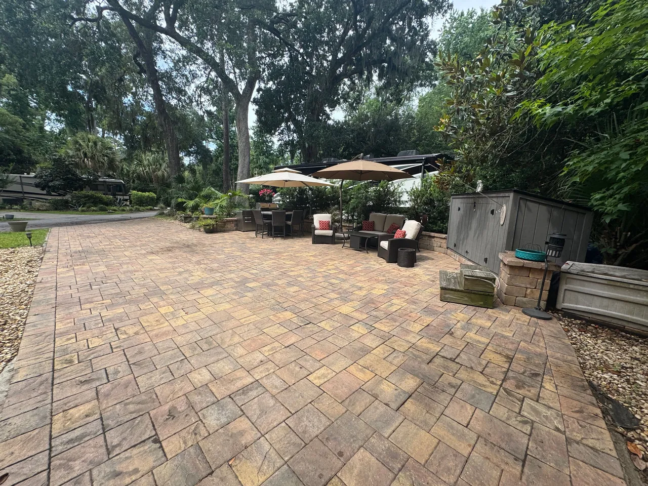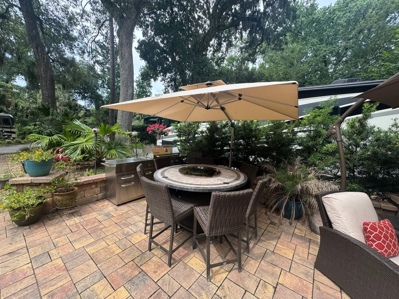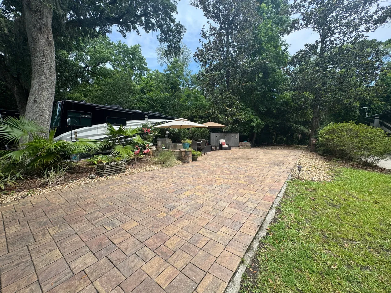 RV Lot 114 has a paver pad accented with beautiful paver wall and can accommodate any size coach along with 2 vehicles. This lot comes complete with irrigation, landscape lighting, large storage shed, 2 large umbrellas, sofa with cushions and matching chairs, high-top table with 8 chairs and a large grill. EXCELLENT RENTAL POTENTIAL!