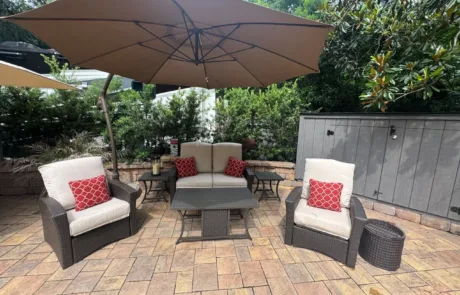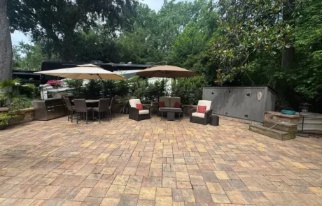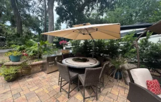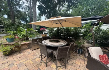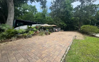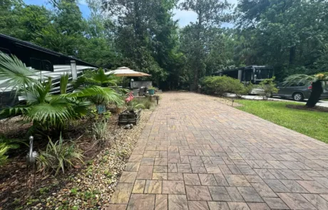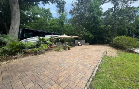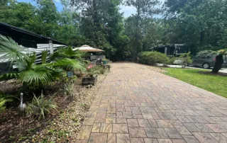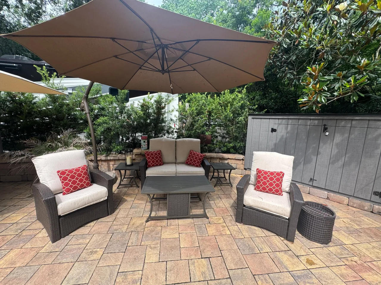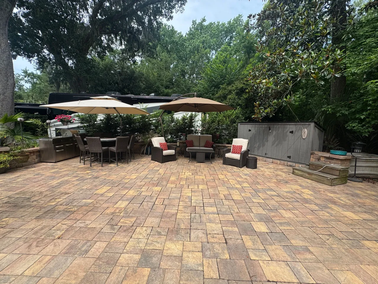 RV Lot 114 has a paver pad accented with beautiful paver wall and can accommodate any size coach along with 2 vehicles. This lot comes complete with irrigation, landscape lighting, large storage shed, 2 large umbrellas, sofa with cushions and matching chairs, high-top table with 8 chairs and a large grill. EXCELLENT RENTAL POTENTIAL!