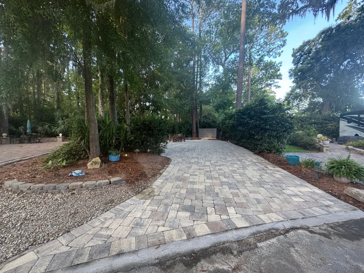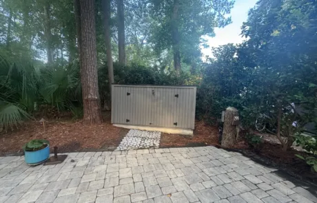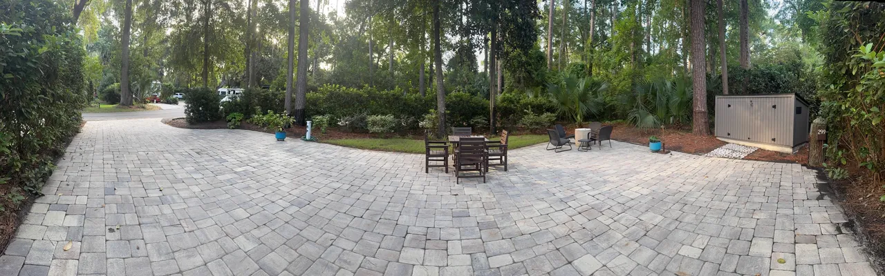 This gorgeous LARGE PERIMETER RV lot has a paver pad and can accommodate a 45′ coach with 2 vehicles. This lot comes complete with irrigation, landscape lighting, newer storage shed, table with 4 chairs, and a firepit. This RV lot has excellent rental history!