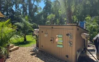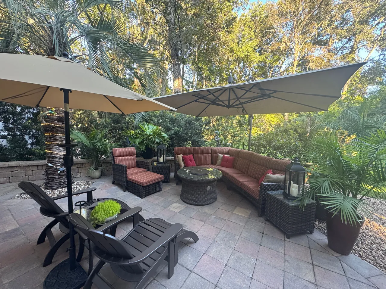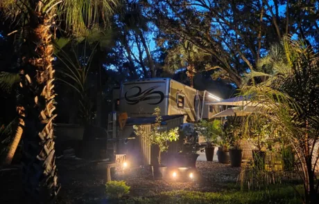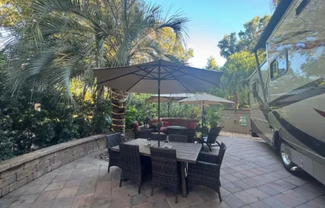 PERIMETER RV Lot #281 is BEAUTIFULLY landscaped with a paver pad that can accommodate a 42’+ coach with a tow vehicle. The mature landscaping and outstanding landscape lighting makes this lot the perfect lot for entertaining! Storage shed, table with seating for 6, two Adirondack chairs, sofa and loveseat, and 2 umbrellas will convey with purchase.