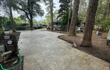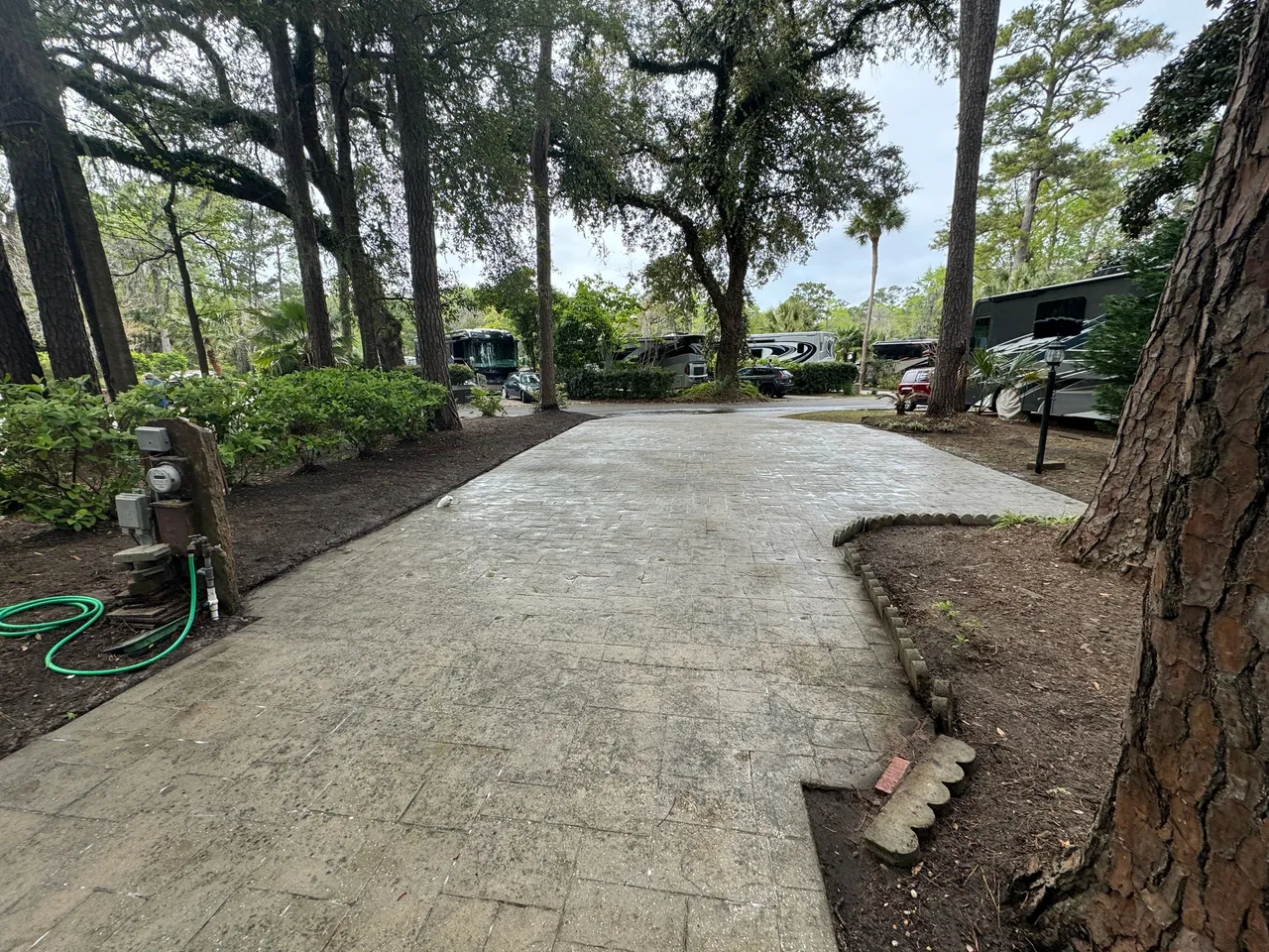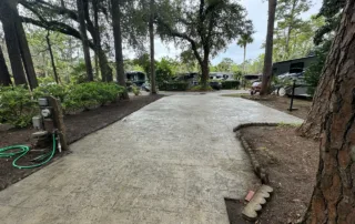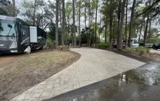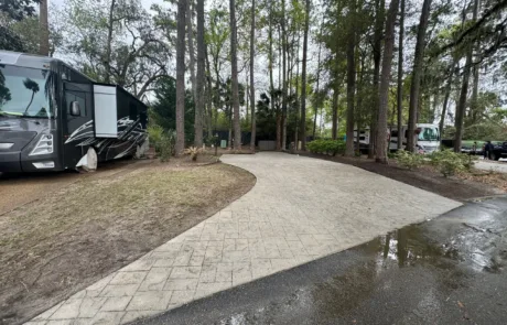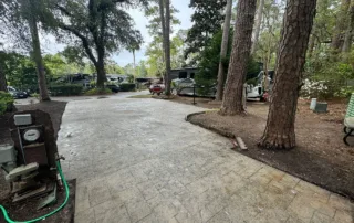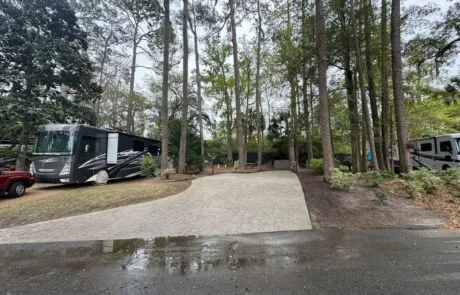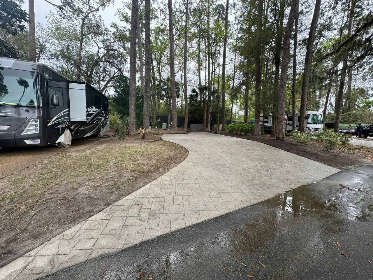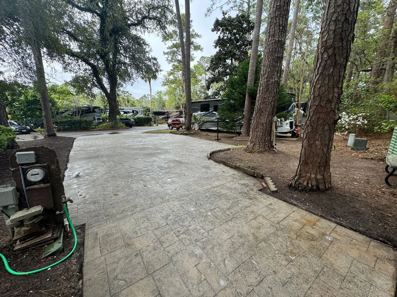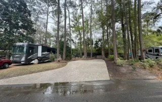 Indulge in Tranquil Escapes: Explore the panoramic beauty of LAKE VIEW RV Lot #327, boasting a generously sized stamped concrete pad thoughtfully designed to accommodate your 42′ coach along with two vehicles, providing ample space for relaxation and exploration amidst stunning natural surroundings.